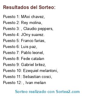 Lista de participantes: Pablo leonel,, Rey molina,, Sebastian cosci,, Franco farias,, Ezequiel melantoni,, Luis paz,, Gabriel britez,, Fede catalan, , Ivan melian, , Claudio peppers,, MAxi chavez,, JOny suarez..