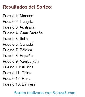 Lista de participantes: Australia, Bahréin, China, Rusia, España, Mónaco, Canadá, Austria, Azerbaiyán, Gran Bretaña, Hungría, Bélgica, Italia.