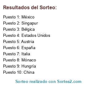 Lista de participantes: Mónaco, Hungría, México, Austria, Italia, Singapur, España, China, Estados Unidos, Bélgica.