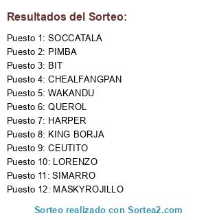 Lista de participantes: SIMARRO, QUEROL, MASKYROJILLO, BIT, CHEALFANGPAN, LORENZO, PIMBA, HARPER, SOCCATALA, KING BORJA, CEUTITO, WAKANDU.