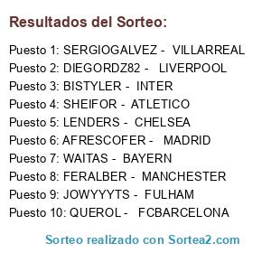 Lista de participantes: AFRESCOFER - MADRID, BISTYLER - INTER, DIEGORDZ82 - LIVERPOOL, FERALBER - MANCHESTER, JOWYYYTS - FULHAM, LENDERS - CHELSEA, QUEROL - FCBARCELONA, SERGIOGALVEZ - VILLARREAL, SHEIFOR - ATLETICO, WAITAS - BAYERN.