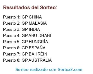 Lista de participantes: GP AUSTRALIA, GP MALASIA, GP CHINA, GP BAHRÉIN, GP ESPAÑA, GP MÓNACO, GP ALEMANIA, GP HUNGRÍA, GP BÉLGICA, GP ITALIA, GP SINGAPUR, GP JAPÓN, GP INDIA, GP COREA DEL SUR, GP ABU DHABI, GP EEUU, GP BRASIL.