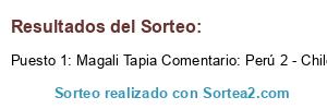 - Ganador: Magali Tapia Comentario: Perú 2 - Chile 1 vamos Perú ya somos campeones 🍀🍀🍀🍀🍀🍀🍀