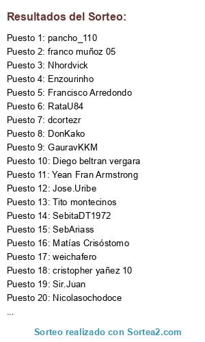 Lista de participantes: dcortezr, RataU84, Enzourinho, Marco Garcia Araneda, waton jadue, Jhonj, Sir.Juan, Nicolasochodoce, Jose.Uribe, cristopher yañez 10, Bastian yañez10, Francisco Arredondo, SebitaDT1972, Ellocomanu64, hriday_karnani, GauravKKM, franco muñoz 05, Nhordvick, Diego beltran vergara, SebAriass, Yean Fran Armstrong, Matías Crisóstomo, Tito montecinos, arn magnusson, Siriusblakid, Aaroncitto, weichafero, pancho_110, Afrojimenez, pabmartinezr, DonKako, cristianxito.