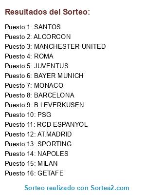 Lista de participantes: JUVENTUS, MONACO, SANTOS, ALCORCON, RCD ESPANYOL, BARCELONA, MILAN, AT.MADRID, PSG, NAPOLES, B.LEVERKUSEN, SPORTING, BAYER MUNICH, MANCHESTER UNITED, GETAFE, ROMA.