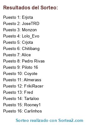 Lista de participantes: Fred, Lolo_Evo, Almerass, Monzon, Alice, Coyote, FrikiRacer, Tartaloo, JoseTRD, Carlinhos, Pedro Rivas, Crjota, Erjota, Chitibang, Rooney1, Piloto 16.