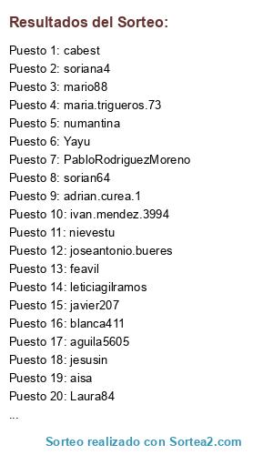 Lista de participantes: ABD, mautiko, GR1975, rafitamg, Fran, aisa, feavil, cabest, die, Nadia, EDSOR, Nakineiu, sorian64, anabeljv, Mary, margav_v, javier207, raxfer09, Vicha, MONICA, lapoza, Maidarlin, soriana4, MH1949, VEGA, numantina, Margaritina, VIVI, witu2, darbyy, raxfer, Laura84, kase, Paula, aguila5605, martita565, Yayu, josesoria, nievestu, mario88, saragallar, berta.demiguelgordo, lanena.morenaflamenca, arturo11, blanca411, juliana18, marcos.madrugapardo, ivan.mendez.3994, mercedes.dominguez.94402, beagd, berronica, beatriz4161, cristian.saezbadorrey, Servan.PF, rosita, adrian.curea.1, tomasi123, euti20, leticiagilramos, vanessa.nunezromero.73, PabloRodriguezMoreno, rocio.nunezromero.1, Carmen Romero1428434900, belen.alvarezcueto, maria.trigueros.73, joseantonio.bueres, miguelangel.alvarezsantos, jesusin, mpaz.perezgarcia, ruli.