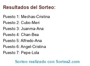 Lista de participantes: Juanma-Ana, Chan-Bea, Angel-Cristina, Alfredo-Ana, Mechas-Cristina, Pepe-Lola, Cubo-Meri.