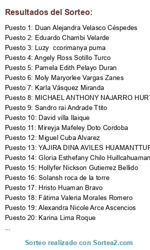 Lista de participantes: Nelly Alexandra Cano Arredondo , Nadiuska Yoselin Luque Huillca , Hillary Santander , Alejandra Zavaleta Carmelino , Lourdes Pamela Gamarra López , Maryory Yañez Ramos , Pablo Sebastian Castro Vargas , Bedrick Ill'm Hernani Dongo , Ana Victoria Álvarez Ayqui , Jean Franco Paucar Pacheco , Diego Alonso Alfaro Herrera , Karen Yosanira Arminta Ochoa , Alexandra Patricia Baca Paz , Lily Elena Huaman Conde , Paul Quillahuaman Romoacca , Thais Alexandra Alanoca Amao , Christian Loayza Villalba , Hristo Huaman Bravo , Carolina Montoya Perez , Raisa Mercedes Tito Durand , Grecia Katherine Petzoldt Enríquez , Diana Marcelo Tinta , Anthony Geordanno Segovia Hurtado , Laurem Estefany Castillo Guillen , Alethia Azarpay Aucapuri Vallenas , Paola Miranda Fernandez , Jimena Aroni Surco , Angely Ross Sotillo Turco , yhoumira vanesa monzon huillca , Mildred Silvia Cavero Enciso , Shiomara Lonconi Soto , Genaro Ormachea , Iliá Adriana Choquemaqui Cruz , Danae carolina villafuerte prado , Nolberto carlos sacsahuillca cabrera , Nohely Sarai Acuña Anchaya , Ana paula ayala , Jhordy atayupanqui cayo , Glisshet Gutierrez Baca , Rosa María Rios Mancco , Mariajosefa Flores Amaya , Nadir Lida Mamani Escalante , Brenda Elena Cavero Castro , MICHAEL ANTHONY NAJARRO HURTABO , Emperatriz Rosa Baca Visaga , Karina Lima Roque , Mireyja Mafeley Doto Cordoba , Duan Alejandra Velasco Céspedes , Angela Miryam Estacio Pimentel , Alexandra Nicole Arce Ascencios , Miguel Cuba Alvarez , Alejandra Michelle Salazar Larrea , Beatriz Tupacyupanqui Zuniga , Albina Tupacyupanqui Zuniga , Allison Astrid Pinedo Cavero , Jaír Ayrton Rojas Terrones , Erika Vanessa Rimachi Ramos , Diana Baca Soto , Moly Maryorlee Vargas Zanes , Lizbeth porras peñafiel , Angie huallpacuna cañari , Melanie Nicole García Sánchez , Santiago Alonzo Flores Ortiz , Salazar Aragón , Gonzalo Lizardo Pérez Chirinos , Yecid kateri quispe huarancca , Marcelo Huarcaya Minauro , Kiara Lucero Quiroz Unda , Nicole herencia nuñez , Lizette Paola natividad florez , YAJIRA DINA AVILES HUAMANTTUPA , Alexandra Nina Quispe , Hans Anthony Quispe Jaimes , Soledad Rivas Peña , Jeyson Henry Chanco Cuentas , Kamila Peña De La Colina , Lourdes Yupanqui retuerti , Luz Gabriela Felix Guzman , Karla Vásquez Miranda , Carmen amelia Murillo Peñalba , Nicole Jhoan Guevara Castelo , Yoshiro Barrios Carmona , Luzy ccorimanya puma , Kristel Armuto , Gianina Huallpa Raya , Pamela Edith Pelayo Duran , Franc Villano Avilés , Danitza Suyani Luna Diaz , GABRIELA RIOS TAYPE , Eduardo Chambi Velarde , Luis Brayan Pacheco Quispe , Itala Estefani Peceros Valencia , Solansh roca de la torre , Gabriel Emilio , Bryan andres quispe callañaupa , Karina Ccoa Quispe , Sandro rai Andrade Ttito , Kasummy claudia Mormontoy Choquehuanca , Leny Malú Alexa Quispe Pautre , Enit Jesabel Pinedo Menacho , Elizabeth Mendoza Colquehuanca , Rodrigo Monrroy Alvarez , Pavel Contreras Castañeda , Lenin Sanchez Cruz , Shirley mayori arotaipe gutierrez , Karolay Rebeca Hinojosa Ortiz , Kerly Pamela Ccanchi Zarate , Luz Katheryne Puma Ataulluco , Daysi Melanie Martiarena Solis , Andrea Quinte Pacheco , Lilliam Criss Challco Hallasi , Gloria Esthefany Chilo Huillcahuaman , Brigitte Brenda Quispe Mariscal , Bertha Micaela Ramos Grau , Ivanna Vanessa Quispe Ortega , Katherin Lisset Arana Umeres , Nelly cuellar sullca , Ángela Silvana Palma Barrios , Hollyfer Nickson Gutierrez Bellido , Marcel Rolando Baca Acuña , Rosmery Fernández Tapara , Pilar Paulina Condori Chara , David villa llaique , Nataly Johana , Marcelo Morante Santisteban , Olenka Rodríguez González , Yeraldy Deysy Cusipaucar Cereceda , Dario Tisoc santos , Carol Collana Sotelo , Zadith zara callo zarate , Álvaro Rojas Mateos , Libertad Malpartida Salas , Ivonne Muñiz Quispe , Yosset Martin Molina Ttito , Kenny Brian Diaz Lopez , Javier tupayachi flores , Mayte Fatima Pareja Pimentel , Angela Vanesa Araoz Castillo , Maciel Stephanie Cardoso Medina , Fátima Valeria Morales Romero , Jualex Brian Soto Peralta , Carmen nohelia portugal salas , Shakira Flores Chacón , Yordi Alexander Perez Roman , Greys Begazo Aparicio , Lucero ortiz huayapa , Sebastian Raul Estrada Cuba , Maria Fernanda Ito Rivera , Laura Huaman , Mariela Vivanco , Lorena Ponce Morales , , .