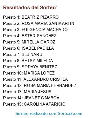 Lista de participantes: ALEXANDRU CRISTEA, MARISA LOPEZ (4 participaciones), SORAYA BENITEZ(2 participaciones), ROSA MARIA SAN MARTIN (4 participaciones), FULGENCIA MACHADO(3 participaciones), BEJINARU, ISABEL PADILLA (3 participaciones), BEATRIZ PIZARRO(6 participaciones), BETSY MILEIDA, MIRELLA GAROZ(2 participaciones), ROSA MARIA FERNANDEZ , MARIA JESUS , JEANET GAMBOA , CAROLINA APARICIO , ESTER SANCHEZ (2 participaciones), ESTER SANCHEZ.
