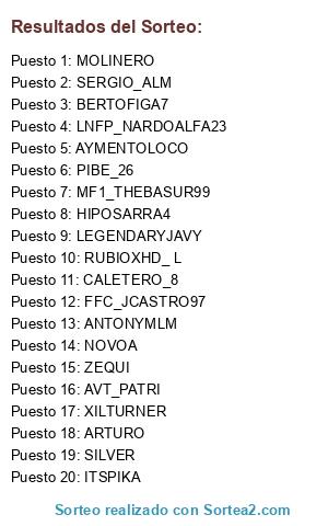 Lista de participantes: FFC_JCASTRO97, CALETERO_8, HIPOSARRA4, RUBIOXHD_ L, AVT_PATRI, LEGENDARYJAVY, MF1_THEBASUR99, LNFP_NARDOALFA23, BERTOFIGA7, AYMENTOLOCO, ANTONYMLM, ARTURO, NOVOA, ITSPIKA, MOLINERO, PIBE_26, SERGIO_ALM, SILVER, ZEQUI, XILTURNER.