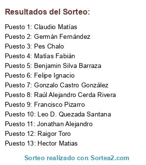 Lista de participantes: Felipe Ignacio, Matías Fabián, Jonathan Alejandro, Pes Chalo, Hector Matias, Germán Fernández, Gonzalo Castro González, Raigor Toro, Raúl Alejandro Cerda Rivera, Leo D. Quezada Santana, Francisco Pizarro, Benjamin Silva Barraza, Claudio Matías.