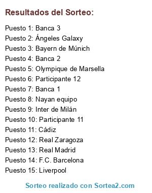 Lista de participantes: Ángeles Galaxy, Olympique de Marsella, Real Zaragoza, Bayern de Múnich, Cádiz, Real Madrid, Nayan equipo, Liverpool, F.C. Barcelona, Inter de Milán, Participante 11, Participante 12, Banca 1, Banca 2, Banca 3.