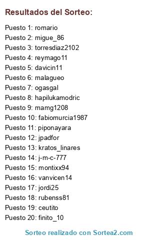 Lista de participantes: ogasgal, migue_86, kratos_linares, piponayara, j-m-c-777, malagueo, vanvicen14, davicin11, ceutito, finito_10, romario, rubenss81, fabiomurcia1987, jordi25, reymago11, montixx94, jpadfor, mamg1208, hapilukamodric, torresdiaz2102.