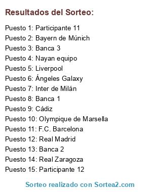 Lista de participantes: Ángeles Galaxy, Olympique de Marsella, Real Zaragoza, Bayern de Múnich, Cádiz, Real Madrid, Nayan equipo, Liverpool, F.C. Barcelona, Inter de Milán, Participante 11, Participante 12, Banca 1, Banca 2, Banca 3.