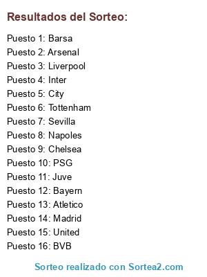 Lista de participantes: Madrid, Barsa, Atletico, Bayern, BVB, Juve, Napoles, Inter, PSG, City, United, Liverpool, Tottenham, Arsenal, Chelsea, Sevilla.