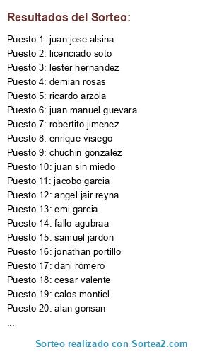 Lista de participantes: jacobo garcia, juan jose alsina, fallo agubraa, demian rosas, ricardo arzola, dani romero, arturo iturbe, gerardo silva, samuel jardon, enrique visiego, robertito jimenez, lester hernandez, calos montiel, misael navarro, licenciado soto, alan gonsan, jonathan portillo, chuchin gonzalez, luigi castro, emi garcia, kevin rodriguez, juan sin miedo, cesar valente, juan manuel guevara, angel jair reyna.