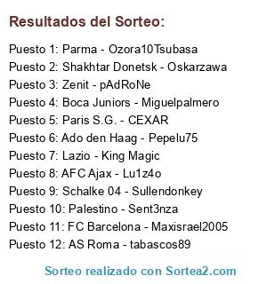 Lista de participantes: Paris S.G. - CEXAR, Lazio - King Magic, AFC Ajax - Lu1z4o, Schalke 04 - Sullendonkey, Parma - Ozora10Tsubasa, Boca Juniors - Miguelpalmero, Zenit - pAdRoNe, Palestino - Sent3nza, Shakhtar Donetsk - Oskarzawa, FC Barcelona - Maxisrael2005, AS Roma - tabascos89, Ado den Haag - Pepelu75.