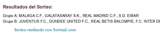 Lista de participantes: REAL MADRID C.F., F.C. INTER DE MILAN, DUNDEE UNITED F.C., S.D. EIBAR, REAL BETIS BALOMPIE, GALATASARAY S.K., MALAGA C.F., JUVENTUS F.C..