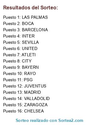 Lista de participantes: CITY, BARCELONA, PSG, MADRID, VALLADOLID, CHELSEA, BAYERN, ATLETI, LAS PALMAS, JUVENTUS, ZARAGOZA, BOCA, UNITED, RAYO, SEVILLA, INTER.