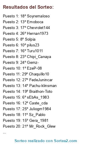 Lista de participantes: 1º EzeP-08, 2º marcelo_98_01, 3º diegotigre, 4º Maty-1984, 5º palazzoargento, 6º sEbAs_1983, 7º Chuly_Gonnet, 8º Solpia, 9º pablo_CJA, 10º pilus23, 11º Sz_Pablo, 12º Caste_cda, 13º Emoboca, 14º Pachu-klinsman, 15º Gera_1981, 16º Turu1011, 17º Chevrolet144, 18º Soyremaloso, 19º Braithon-Toto, 20º Gonynel, 21º Mr_Rock_Glew, 22º HanArgento, 23º Chipi_Canaya, 24º Gemz-, 25º Juliogm1984, 26º Hernan1973, 27º FedeJunincar, 28º FigasaFC, 29º Chaquillo10.