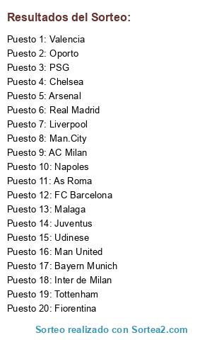 Lista de participantes: Juventus, Liverpool, Napoles, PSG, Oporto, Udinese, Valencia, Malaga, Fiorentina, As Roma, Chelsea, Inter de Milan, Bayern Munich, Man United, Arsenal, Man.City, AC Milan, FC Barcelona, Real Madrid, Tottenham.