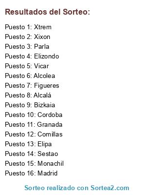 Lista de participantes: Comillas, Figueres, Xtrem, Vicar, Cordoba, Bizkaia, Alcolea, Granada, Elipa, Madrid, Elizondo, Alcalá, Xixon, Parla, Sestao, Monachil.