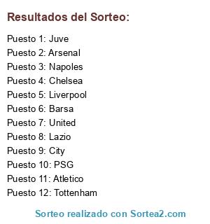 Lista de participantes: Napoles, Barsa, Juve, PSG, Atletico, City, Lazio, United, Chelsea, Tottenham, Arsenal, Liverpool.