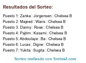 Lista de participantes: Yukita Sugita Chelsea B, Konstantinos Lamprou Chelsea B, Filip Djuricic Chelsea B, Jordon Mutch Chelsea B, Jordy Clasie Chelsea B, Tonny Vilhena Chelsea B, Pajtim Kasami Chelsea B, Lucas Digne Chelsea B, Nelom Miquel Chelsea B, Gabriel Silva Chelsea B, Gotoku Sakai Chelsea B, Lorenzo Insigne Chelsea B, Danny Rose Chelsea B, Jean_Paul Boëtius Chelsea B, Christian Atsu Chelsea B, Zanka Jorgensen Chelsea B, Jeffrey Bruma Chelsea B, Abdoulaye Ba Chelsea B, Christian Benteke Chelsea B, Emmanuel Mayuka Chelsea B, Majeed Waris Chelsea B.