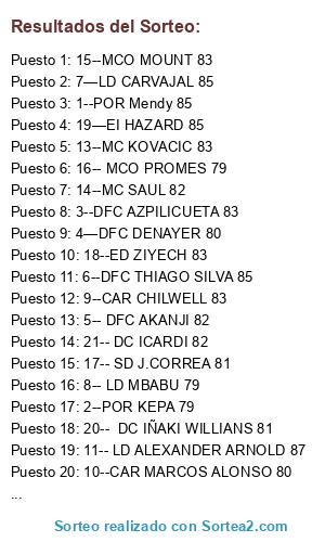 Lista de participantes: 1--POR Mendy 85, 2--POR KEPA 79, 3--DFC AZPILICUETA 83, 4—DFC DENAYER 80, 5-- DFC AKANJI 82, 6--DFC THIAGO SILVA 85, 7—LD CARVAJAL 85, 8-- LD MBABU 79, 9--CAR CHILWELL 83, 10--CAR MARCOS ALONSO 80, 11-- LD ALEXANDER ARNOLD 87, 12-- MCD ONYEKA 75, 13--MC KOVACIC 83, 14--MC SAUL 82, 15--MCO MOUNT 83, 16-- MCO PROMES 79, 17-- SD J.CORREA 81, 18--ED ZIYECH 83, 19—EI HAZARD 85, 20-- DC IÑAKI WILLIANS 81, 21-- DC ICARDI 82.
