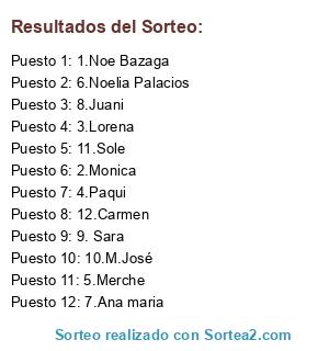 Lista de participantes: 1.Noe Bazaga, 2.Monica, 3.Lorena, 4.Paqui, 5.Merche, 6.Noelia Palacios, 7.Ana maria, 8.Juani, 9. Sara, 10.M.José, 11.Sole, 12.Carmen.