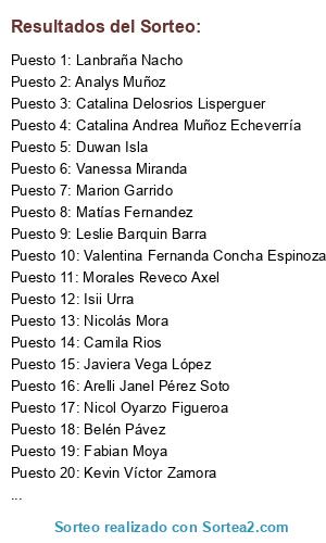 Lista de participantes: Catalina Delosrios Lisperguer, Consuelo Anaiz, Fran Bernal Pavez, Aliine Reyes, Bastian Ignacio, Analys Muñoz, Lindsay Michelle, Mariana Condeza, Chëchïtö Välêntë Ignacio Antillanca, Paula Leiva, Kevin Víctor Zamora, Francisco Javier Veas Gutierrez, Brigitte Natalia, Katty Plaff, Angie Adriana Romero, Rosario Aninat, Vanne Flores, Makita Gallardo Muñoz, Rosa Ascoy Reyes, Bárbara Paillao Cortés, Constanza Catalán, Aylin Leyton, Tania Torres, Valentina Villa Villarroel, Damaris Valentina Vargas, Pato XD, Felipe Riveros, Mariiaeriikaa Reyes Ortega, Christian Ludueña, Giselle melo, Nadia Lara Oliva, Yuquina Díaz, Javi González Nicolaides, Arelli Janel Pérez Soto, Felipe Vásquez, Bahar Macarena, Héctor Carrera, Andrea Osorio González, Riquelme Belén, Kote Álvarez, Kassandra Nicole, Adriana Carrasco, Marion Garrido, Nan Moya, Fernando Andres Sanchez, Francisca González Romero, Francisco Muñoz Cuevas, Victoria Daniela Catalán Salas, Edith Pulina Galaz Montoya, Natalie Gajardo, Tamara Montero, Layli B. Arrollo, Héxtor Bustos Copelli, Carolina Fuentes, Eduardo Bustamante, Jenn Joanne, Dominique González, Alan Moisés López Bustos, Mara Valentina, Clauu Labbé, Gema Hidalgo, Macarena Yañez Valenzuela, Jonathan Mora, Magdalena Valenzuela, Yenifer Andrea Rivera Esquivel, Catalina Aguilera, Tania Aleli Pérez Serrano, Nicole Figueroa, Nicol Oyarzo Figueroa, Katherine Briones, Alejandra R Riveros, Anita Guzmán, Constanza Walker, Ana Patricio González, Camila Guzmán, Patricia Lazo Mardones, Camilita Andrea, Mary Ramírez, Arabella Lionette, Paolis Ram, Ruby Bieb’s Muñoz, Katherine Zañartu, Yessenia Miralles Alvarado, Lelia Poblete, Iribarren Alex, Ana María Vega, NiceBlack Sabse, Valentina Araos, Javiera Pérez Silva, César Aravena Díaz, Kade Kadyta, Francisca Constenla Villanueva, Stephania Belen Pinchetti Salazar, Sara Fernanda, Axel Fernández Leiva, Marjorie Cortés de Soto, Javiera Ortega, Alison Ayrton Plasencia Fernández, Danitza Tapia Cuevas, Katherinne Soto, Kenita Urrutia González, Ignacio Fabian Rojas Valenzuela, Diego Soto Acevedo, Camila Rios, Maria Leyton, Aylin Riveros Rojas, Christian Tobar, Laura Mazu, Angélica María Mora, Paty Ibarra, Raisha Vinet, Jacqueline Zuñiga Rubio, Angela Leiva López, Luis Fer Espinoza Louivano, Josefa Rojas, Juan Painén Bañares, Edwards Soto, Rubi Quilaqueo, Claudio Anibal Cantante, Fefhi D'Fly, Cata Díaz, Marcela Calderon González, Rodrigo Mora, Fito Castro, Antonella Muñoz, Millaray Guzmán Calderón, Angela Susana Campos Pozo, Madeleine Álvarez Espina, Estefani Ganga, Carolina Cortes Luck, Matias Gamad Ulloa Sepulveda, Loreto Silva Ibarra, Viotto Calagaz, Nubia Natasha, Cinthia Anticoi Martínez, Steven Walker, Valeria Jiménez, Nayaret Sofía Villa Cavieres, Bairon Henriquez, Alison Flores, Rocio Roos Figueroa, Stephanie Nicole Herrera Toledo, Daniel Iván Rojas Chandía, Yenny Escalera MT, Naomi Genissa Velásquez, Tammy Sandoval, Javiera Knowles, Almendra Cordova Saavedra, Tamy Belen, Constanza Cáceres Marín, Miguel Angel Soto Serrano, Kata Muñoz, Vala Gómez Borelli, Pepe Prz, Marce Lita Del Pino, Nicolás Wiertz, Maca Guzmán, Damaris Catalina Ramírez, Leo Canelo, Betania Macarena Sepúlveda Silva, Ignacia Cornejo, Toothy Ruthy Noemi, Bastian Núñez, Víctor Fantasma Sarmiento, Víctor Pizarro, Nicole Castillo Sáez, Damaris Fernanda Orellan Pizarro, Daniela Uribe, Yaris Bueno, Natalia Latham, Denisse Carey Rojas, Ismael Matthew Charles Sanders, Matias Marilao Huenulao, Pascuala Kagamine, Lorena Rod, Yorka Valenzuela Chamorro, Mathias Iturriaga, Sebastian Canelo, Angélica Araya Petit, Alex Sebastián, M'onsita D'y Y'ulita, Fabián Bello Bustamante, Alejandro Salas Bartsch, Claudia Traro, Orlando Andres Dy Jenniffer, Ivanny Andrea Rivero Donoso, Camilo Laprida Acuña, Ailin Lorca, Kenshin Himura, Leslie Barquin Barra, Belén Pávez, Katherine Saldivia, Valentina F. Cisternas, Pamela Maricel, Debora Roa, Joyce Martínez Muñoz, Francisca Vargas, Camila Tapia, Jhon Peter Andia, Isaac Poblete, Yaritaw Alegría Huenupan, Matías Torres Soto, Naiomi Pascale, Hernández Torres Andrea Gabriela, Luis Zambrano, Sritaa Almenaa San Martín, Renata Rivera Olivares, Daike Rucker, Karina Alexandra Vásquez, Bruno Soto, Koni Becerra, Nicole Stephanie Rubilar Durán, Natalia Osorio Herrera, Emanuel Alvarado, Susan Ibaceta, Seba de la Fuente, Natty Natty, Morales Reveco Axel, Roxanitha Ft. Alice Cortez Gutierrez, Génesis Chacón Padilla, Raquel Almendra, Julio Vallejos Müller, Tamara Ignacia Bustos Ramírez, Juan Pablo Olguin Jones, Dani Eugenia, Daniela Belén Navarro Crocci, Carlos Aníbal Urra Urra, Enrique Arturo Retamal Antilef, Ávila Barber, Erika Valeria Portuguez Muñoz, Estrella Bais Fuentes Rivera, Madelaine Sandoval León, Javiera Belén, Catalina Andrea Muñoz Echeverría, Matías Fernandez, Virginia Rondón, Sebastián Reyes González, Avi Nieto Inzunza, María Francisca Barrueto, Katherine Astudillo, Susana Espinoza Contreras, Yuki Naya, Francisca Stange, Paula Mella de Santibañez, Sofia Moren Guina, Niki Solis, Yeny Mizu Harumi, Miguelito Dmc, José Mardones Catripan, Ignacio Alonso Carrasco González, Alan Donoso, Vilenka Rodríguez, Isii Urra, Fran Acuña Juica, Miguel Ángel Retallack Salazar, Diana Santander, Cristopher Torres, Nicolás Lizana Arancibia, Karen Cid, Camila Estefany Arias Barrios, Sebastián AR, Clau Avalos Morales, Leslie Karín, Nicolás Mora, Constanza Leticia González Pizarro, Marion Andrea Orellana León, Bruno Whiskas, Yadier Mengual Ramírez, Alejhandra Sofía Araya Cortinez, Daniela Sepúlveda Ordenes, Javiera Vega López, Marcelo Andrés Monsalve, Angélica María Letelier Romero, Fabián Llaima, Francisco Javier Pinto Ipinza, Tania Contardo, Jeferson Alexander Veramendi, Vaitiare Pinto Ruz, Patricio Guzman Droguett, Enock TIpecqmf, Lore Espinoza Spnz, G'ssll Adelinee A Ulloa L'essegui, Guillermo González Sánchez, Daly Evans, Duwan Isla, Fab
