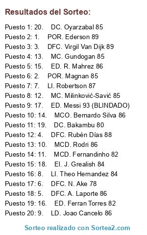 Lista de participantes: 1. POR. Ederson 89, 2. POR. Magnan 85, 3. DFC. Virgil Van Dijk 89, 4. DFC. Rubén Días 88, 5. DFC. A. Laporte 86, 6. DFC. N. Ake 78, 7. LI. Robertson 87, 8. LI. Theo Hernandez 84, 9. LD. Joao Cancelo 86, 10. MCD. Rodri 86, 11. MCD. Fernandinho 82, 12. MC. Milinković-Savić 85, 13. MC. Gundogan 85, 14. MCO. Bernardo Silva 86, 15. ED. R. Mahrez 86, 16. ED. Ferran Torres 82, 17. ED. Messi 93 (BLINDADO), 18. El. J. Grealish 84, 19. DC. Bakambu 80, 20. DC. Oyarzabal 85.
