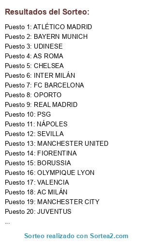 Lista de participantes: FC BARCELONA, MANCHESTER CITY, UDINESE, ÁRSENAL, BORUSSIA, NÁPOLES, MANCHESTER UNITED, REAL MADRID, ATLÉTICO MADRID, CHELSEA, VALENCIA, TOTTENHAM, FIORENTINA, LIVERPOOL, BAYERN MUNICH, AC MILÁN, PSG, INTER MILÁN, JUVENTUS, OLYMPIQUE LYON, SEVILLA, AS ROMA, OPORTO, VILLARREAL.