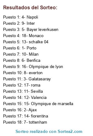 Lista de participantes: 1- Porto, 2- Ajax, 3- Galatasaray, 4- Napoli, 5- Bayer leverkusen, 6- Benfica, 7- tottenham, 8- everton, 9- Inter, 10- Milan, 11- Sevilla, 12- Valencia, 13- schalke 04, 14- fiorentina, 15- Olympique de marsella, 16- Olympique de lyon, 17- roma, 18- Monaco.