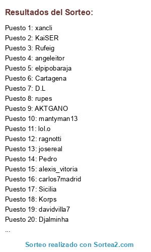 Lista de participantes: madridista87, -Calvente-, javicalavera7, xancli, fox1192, DUBIDU, zlatan-leo, AKTGANO, moya, RuBo, alexis_vitoria, MiguelR29, Orbi, arnau08pro, fer_1980, Djalminha, Cartagena, KaiSER, Tiojack, bart1983, lol.o, Pepe Sevilla, rodri9torres, realrubio, PES-K.O, guateke, Sicilia, _-CaTa-_, megazoft, seskin, __tete__, Goro, joninho08, kike47, rupes, REDSPANISH, Priego, davidvilla7, BurfoK, davidvv01, juanvins, Pedro, chooruy, elpipobaraja, G2JONIMON, D.L, Putosuizo, Angel, ragnotti, Korps, angeleitor, hugo23, josepmiquel, Anagaxtra21, josereal, carlos7madrid, Jorgefumi, mantyman13, Ivan96tiki-taka, Aitor90, forey, Horsy, juanjo84, montibiri, stevez, Rufeig, nAi10, ismael_90.