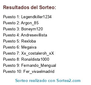 Lista de participantes: Andresevillista, Boneym120, Ronaldista1000, Argon_85, Fer_vivaelmadrid, Legendkiller1234, Megaiva, Rexloba, Fernando_Mengual, Xx_costaleroh_xX.