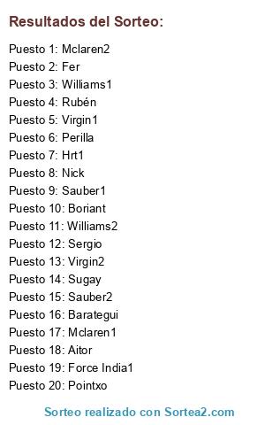 Lista de participantes: Boriant, Perilla, Sugay, Pointxo, Aitor, Rubén, Fer, Sergio, Nick, Barategui, Force India1, Williams1, Mclaren1, Hrt1, Mclaren2, Williams2, Virgin2, Sauber1, Sauber2, Virgin1.