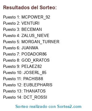 Lista de participantes: JUANMA, VENTURI, PODADOR86, JOSERL_85, PACHIS88, BECEMAN, GOD_KRATOS, ZALUS_NIEVE, THANATOS, PELAEZ82, MCPOWER_92, MORGAN_TURNER, EUBLEPHARIS, DCT_ROSSI.