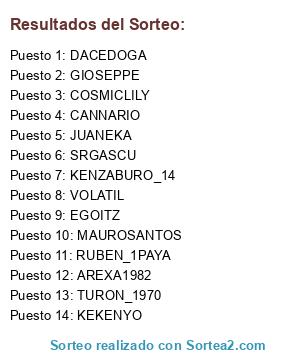 Lista de participantes: CANNARIO, MAUROSANTOS, COSMICLILY, SRGASCU, VOLATIL, JUANEKA, DACEDOGA, AREXA1982, KENZABURO_14, RUBEN_1PAYA, KEKENYO, TURON_1970, EGOITZ, GIOSEPPE.