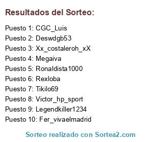 Lista de participantes: Tikilo69, CGC_Luis, Deswdgb53, Fer_vivaelmadrid, Legendkiller1234, Megaiva, Rexloba, Ronaldista1000, Xx_costaleroh_xX, Victor_hp_sport.