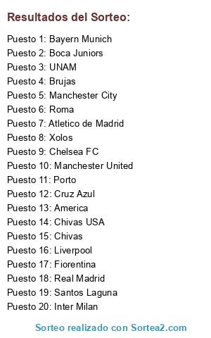 Lista de participantes: Roma, Manchester City, Brujas, America, Atletico de Madrid, Chivas USA, Chelsea FC, Inter Milan, Manchester United, UNAM, Chivas, Porto, Cruz Azul, Real Madrid, Liverpool, Xolos, Bayern Munich, Fiorentina, Santos Laguna, Boca Juniors.