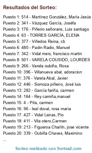 Lista de participantes: 372 - Santos Portas, Jose Maris, 376 - Varela Abal, Javier, 421 - Glaser Lede, Miguel, 439 - Iglesias Rivas, teresa, 278 - Dominguez Padin ,Jose, 426 - Juncal Portas, Marta María, 176 - Piñeiro señorans, Luis santiago, 134 - Castro Rey, Ángel, 22 - dominguez padin , manuel, 156 - Carrión Álvarez, Carlos, 485 - González pomares, Benito, 514 - Martínez González, María Jesús, 51 - Ríal lastres, Fernando, 85 - Santamaria juncal, Mercedes, 62 - Rodríguez Vázquez, Alberto, 501 - VARELA COUSIDO, LOURDES, 297 - Gómez Crespo, José Manuel, 477 - Sineiro García, Miguel, 507 - Mayan Garrido, David, 351 - padín Cortez,severo, 202 - Dios Garcia, Dolores, 452 - Bouzada Piñeiro, Rodrigo, 195 - Otero fariña,s.c., 189 - Buceta,alfonsin,Rosa, 495 - Vázquez Vázquez-Núñez, Rafael, 129 - Martinez Gonzalez, Rosa, 128 - Prado Martinez,Maria Jesus, 425 - Martínez lede, Carmen, 339 - Oubiña Chaves, Maximino, 266 - Varela oubiña, Rosa, 262 - Feijoó Falcón, Jesús, 504 - Buceta Otero, gumersindo, 462 - Varela cousido, gabino, 166 - Chaves Patiño, Jorge, 480 - Padin Radio, Manuel, 428 - Magariños carreras, Manuel, 447 - Farina Dopazo, Genoveva, 411 - Vila otero,Carmen, 79 - Reguera Abal, Peregrina, 174 - Platis Cores, Antonio, 355 - Prado Agra, Olalla, 412 - Oubiña abal, Vicente, 366 - Duarte morgade, jose, 216 - comun, 173 - Padin Vieites, Manuel, 5 - FAMILIA FONTAN TRONCOSO,CB, 145 - Paz Lede, Juan Manuel, 215 - Barral González,Ruben, 224 - Torres Padín, José Angel, 158 - Casal Escudero ,M. Celia, 446 - Somoza piñeiro, José luis, 47 - Ruibal costa, María ines, 377 - Viñedos Reina, cb, 423 - Muñiz López, eva, 282 - García fariña, carmen, 506 - Suárez Chaves, Marina, 341 - Vázquez García, Joséfa, 46 - Villar Fariña, Socorro, 213 - Figueroa Charlín, jose vicente, 518 - Padín Álvarez, Ana Isabel, 7 - Dadín Padín, María Mercedes, 460 - Besada González, María José, 306 - Feijoo Padin,Luisa, 311 - PADIN GARCIA, CARMEN, 116 - Varela Martinez, Raquel, 164 - Rey camiña,manuel, 519 - Barreiro Martinez ,Milagros, 96 - leal doval, rosa maria, 359 - Fandiño Salgueiro, Antonio, 4 - Pita, carmen, 1 - A númeto un 219,CB, 321 - González varela, Gonzalo, 67 - Lede noya, edelmiro, 483 - Paz Pérez, Carmelo, 342 - Vidal meis, francisco martin, 361 - Santorun Santorun, Ramón, 503 - Martínez Castro, Rafael, 336 - Outeda Outeda, María Pilar, 207 - Soutullo Fernandez, Jesus, 433 - Martínez Fontan, Luciano, 453 - Maquieira Piñeiro, David, 100 - Roel Solla, José, 427 - Vidal Leiras, Pio, 310 - Casal Vázquez, Sonia, 244 - Martínez Menino,Ero, 280 - Eirín Leal, Isidro, 338 - Alvarez González, Francisco, 492 - Vidal torres,santiago, 140 - Touriño reboredo, javier, 371 - Vázquez grande, antonio, 396 - Villanueva abal, adoracion, 497 - Barreiro Gómez, jesus, 246 - Arez Vázquez, Miguel, 105 - PEÓN PAZ, MARÍA ESTHER, 356 - Hermanos sabaris prado, cb, 142 - Portas Gonzalez, Carlos, 125 - Eladio, CR, 349 - José Luis, CR, 347 - Vila. CR, 63 - TORRES GARCÍA, ELENA, 181 - AROSA VILLAR, MANUEL ENRIQUE.