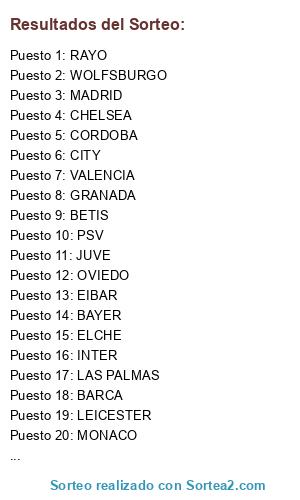 Lista de participantes: BARCA, MADRID, BETIS, ATLETICO, EIBAR, LEVANTE, CORDOBA, JUVE, LEICESTER, BAYER, OVIEDO, GRANADA, CITY, MALAGA, MILAN, INTER, LAS PALMAS, ARSENAL, CELTA, MONACO, PSG, ELCHE, VALENCIA, PSV, LUGO, WOLFSBURGO, CHELSEA, RAYO.