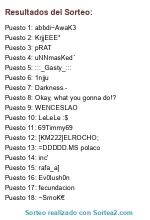 Lista de participantes: [KM222]ELROCHO;, Okay, what you gonna do!?, =DDDDD.MS polaco, abbdi~AwaK3, fecundacion, Ev0lush0n, ~SmoK€, LeLeLe :$, 69Timmy69, rafa_a], Darkness.-, :::_Gasty_:::, WENCESLAO, uNNmasKed´, 1njju, inc', pRAT, KrjjEEE*.