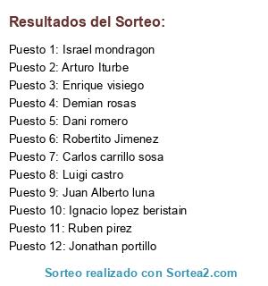 Lista de participantes: Robertito Jimenez, Jonathan portillo, Israel mondragon, Enrique visiego, Ignacio lopez beristain, Juan Alberto luna, Arturo Iturbe, Demian rosas, Carlos carrillo sosa, Ruben pirez, Luigi castro, Dani romero.