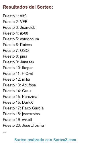 Lista de participantes: lquintopino , pina , Mario Rubio , vmlinuz211 , Grau , Louise , Kwyjibo , jeansrotos , EduardoCarretero , Carlos Escribano , josefirgas , miliu , wikett (2 participaciones), Jompepe , adele , ik-08 (5 participaciones), ostrigonum , Lur , LuisPau , F-Civit (5 participaciones), VFB (4 participaciones), OSO (2 participaciones), Acufope , JoseETosina , paradise , jlaherradon , Janasek , Dincturk , Alf9 (7 participaciones), Domingo Gonzalez , Joséluis , mariluarca , miferom , JFR , Raices , Paco García , txiki (2 participaciones), luis7783 , Juaneleb , Ferezma (2 participaciones), DarkX , Ikepar , Ikepar.