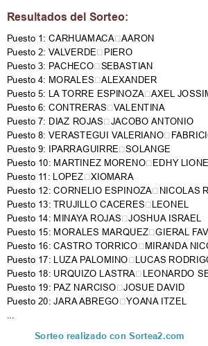 Lista de participantes: GOMEZ VENEGAS NURY MICAELA, LEON RUPAY BRIC AUSTIN, CARRASCO SOTELO YAEL ADRIAN, TRUJILLO CACERES LEONEL, ELBERS CHOZA NICOLE TATIANA, PASARA CAMINO JOSEFINA MARÍA, PAZ NARCISO JOSUE DAVID, FACHO MALDONADO JESSELYN JHIRE, GONZALES FLORES LEONARDO ANTONIO, HURTADO NIÑO GABRIEL GABINO, ESCOBEDO JUY SANDRA VALERIA, LIMAYLLA PACHECO ALEXIS LEONARDO, REYMER BARRIENTOS VALENTINA SAMANTHA, PURCA ALMENARA LUCERO NATALY, DELGADO MORI FERNANDA DANIELA, MENA PAREDES ROBERT LEONEL, MINAYA ROJAS JOSUE ISAC, GOICOCHEA CRUCES PAOLA ALEXANDRA, TRUJILLO CACERES KIARA, SERNA SOTELO JUAN JOSE GIOVANNI, MOLINA VELAZCO DANISA VALERIA, PAREDES TRUJILLO MATTHIAS ESTEBAN, POMA AMPA FABRIZIO JOSE, GONZALES SILVA KAITLYN LUHANA, VASQUEZ SAGARDIA LEANDRO NICOLAS, BARRAZA SARMIENTO SOFIA MYNA, RODRIGUEZ TAFUR ALEJANDRO SEBASTIAN, ARAMBULO MARTEL ADRIAN AUGUSTO, VASQUEZ QUINTEROS ALVARO ANDRES, LLANOS CRUZATT GIANPIERRE, CARRION CIMA GABRIEL, Pando Cano Pedro Luis, JAUREGUI PAUCAR EDUARDO FABRIZIO, GUZMAN AGUILAR JEANPIERRE SOCRATES, BENITES SANDOVAL DIEGO JESUS, REYES RUIZ RICARDO, SENCIO BERNILLA BRYHTNE JAMILE, CIGARROSTEGUI CARRILLO JESUS JOEL, TORRES CORTEZ JULIO LUCIANO, CASTILLO MOSCOSO MARIA FATIMA, CASTILLO MOSCOSO MARCELO ANDRÉ, DIAZ RICSE JOSHUA GIUSEPE, DIAZ RICSE MATIAS GABRIEL, PALACIOS ECHEGARAY LEONARDO DAVID, JUAREZ PUCUTAY BRIANNA ROCIO, CASTRO ORIUNDO ANA VALERIA, REAÑO CALVAY KEVIN LEONARDO, VERASTEGUI VALERIANO FABRICIO ANDRE, CABELLO TOKUDA NATSUMI ANTONELLA, PALOMINO MOROTE HERALD SAID, TORRES HURTADO TIRZA TAMY, MEZA TORRES PIERRE ANDREE, SOTOMAYOR QUIROZ CAMILA, RIVERA AGUILAR JOSE FRANCISCO, Urteaga Tamayoshi Loany Salvatore, GUZMAN AGUILAR KIARA NAOMI, LIMA CUADROS CESAR EMILIO, FERNANDEZ PRO CRISTOPHER, GARCIA ORTEGA ANETTE TATIANA, TORRES CORTEZ MASSIMO FRANCISCO, MURGA FLORES JAKE PATRICK, LARA GONGORA FABIANA DUBE, YUPANQUI ROCA TRACY MARIA, GUERRERO OBANDO RODRIGO ALEJANDRO, CABRERA POLANCO BRYANA ESTEFANY MICAELA, RODAS PEÑA KAVIR FABIAN, CASTRO TORRICO MIRANDA NICOLE, TAMANI RODRIGUEZ WANDAR SABRINA, TAFUR ROMERO JESLYN EYMI, ROJAS CUNIBERTI FRANCO, LIRA GUTIERREZ LUANA FABIOLA, ROMERO URQUIZO HADE MICHELLE, TORIBIO CAÑARI KAREN ESTEPHANIA, JULCA MARTINEZ LINDSAY SHADDEN, CORNELIO ESPINOZA NICOLAS RODRIGO, LUZA PALOMINO LUCAS RODRIGO, MANRIQUE LLONTOP DANIELA RACHEL, LIMAYLLA PACHECO RUTH BELEN, MODESTO CHUMPITAZ ANDRES ALESSANDRO, GUERRA ATAUJE KIARA MISHELL, ANAYA MEJIA ANGEL SAUL, ECHE PAZ JILIHAN GIOVANNA, SALAZAR FALCON KEISY ISABELLA, JARA ABREGO YOANA ITZEL, ACUÑA UGARTE THIAGO ALONSO, SALHUANA FLORES CESAR TIAGO, SANCHEZ LOAYZA ALLISON ISABEL, MORALES MARQUEZ GIERAL FAVIANNA, FLORES BRINGAS ABRAHAM WILLLIAM, PALOMINO POLAR STEPHANO SANTIAGO, GONZALES FLORES MARCELO MIGUEL, DIAZ ESPINOZA DOMINIC AARON, PALOMINO TATAJE ALL TJBOO, MINAYA ROJAS JOSHUA ISRAEL, GARCIA BARZOLA MANUEL ALESSANDRO, LOPEZ DIAZ DAYANARA LUANA BELEN, ZAVALETA TORRES ISABELLA ANTUANETH, ROSALES SUEROS CAMILA ABIGAIL, VEGA ORE SAYUMI ELENA, SANTOS FLORES DARIAN GAEL, TORRES FERREÑAN JOHAN STEPHANO, CONDOR ALVARADO LYRA DAFNE, CELIS CHAVEZ ANGEL THIAGO, DIAZ CABALLERO SERGIO ADRIAN, DIAZ CABALLERO RENZO ANDRE, TUPIÑO SAENZ GUSTAVO GAEL, ALBURUQUEQUE ANGULO DILAN ANDREY, D´ANGELO NATALIN EMILY JANE, CASTILLO CANALES DARIANA NICHOLE, DIAZ ROJAS JACOBO ANTONIO, ENRIQUEZ ESPINOZA BRIANNA KAYLEE, MAGUIÑA TACZA ZU ITZEL, ORMEÑO OSORIO SEBASTIAN DACIO THIAGO, BAUTISTA GALARZA ADRIANNA XIMENA, PABLO SOTO ADRIAN ALONSO, HIDALGO FELIX GUSTAVO SAUL, CHAVEZ SALOME SEBASTIAN ALONSO, TOYCO MENDOZA ALESSIO, TRIGO YALLERCO ABIGAIL ISABEL, TORRES HURTADO DOMINICKA DARSSHY, REYMER BARRIENTOS SALMA SAMANTHA, POZO DAZA RODRIGO SEBASTIAN, REYNA PEREZ DAYLY MILET, OLORTEGUI YEREN SEBASTIAN ANDRÉ, URQUIZO LASTRA LEONARDO SEBASTIAN, LA TORRE ESPINOZA YASSURY SHANDELL, SANGUINETTI PEÑA PAULA MILAGROS, ARREDONDO MORAS NAYELI KRISTELL, VELASQUEZ HUAMANHORQQUE FABIO LUCIANO, VILLASANTE BARRIENTOS JOAQUIN TOBIAS, PUMA HUAMANI SOPHIA ISABELLA, FARIAS CALDERON EDSON DEL PIEROI, CASTRO ORIUNDO JOAQUIN ALONSO, FLORES ROMERO ALESSANDRA MICAELA, ZAPATA COTILLO VALERY XIOMARA, VELASQUEZ NIETO MAXS JUNIOR, MANTILLA MEJIAS KEYLA SHIMARA, VEGA ORE SOFIA ALESHKA, APAZA ALVAREZ JOSE LEONARDO, LIRA GUTIERREZ ANDRE MARCELO, GONZALES MEZA XIMENA PATRICIA, VARGAS CASTRO ARIANA ANTUANED, IPARRAGUIRRE RUPAY IHAN IMANOL, NAVARRO YANCCE SALVADOR ALEXANDER, HUAMAN ALFARO CONNIE MARIANA, TAFUR ROMERO GARETH ARNALDO, CASTRO TORRICO MATHIAS JOSE LUIS, GUERRA QUIQUIA FABRIZIO ARMANDO, LA TORRE ESPINOZA AXEL JOSSIMAR, PALOMINO MOROTE CAMILA ALESSANDRA, CASTILLO OSTOA VALERIA, GOMEZ PARAVICINO JUAN MANUEL, ALCAZAR ORDOÑEZ GONZALO MARTIN, DELGADO MORI MATIAS LEANDRO, MORALES HUAPAYA BASTIAN ADRIAN, REATEGUI MENDOZA CARLA ALEJANDRA, DELGADO YOVERA BRIANNA NICOLE, TOMAYLLA ARONE BRISSA RAFAELA, ATENCIO GONZALES MAURICIO ALEXANDRO, MIRANDA IAN, RIOS SEBASTIAN, FLORES DANIEL, SAUCEDO SAMI, SANCHEZ BELEN, FERNANDEZ ANTONIETA, LOPEZ ACOSTA QADIR FACUNDO, MARTINEZ EDHY, AQUITUARI ANGELO, MOLINA MYRIAM, AQUITUARI TICONA ANGELO NICOLAS, ARAUCO DE LA CRUZ KERVIT PEDRO LUIS, BALLENA SALINAS JORDANA KARELY, CAMPOS MARTINEZ JOAQUIN DAVID, ORTEGAL CASTAÑEDA LISBETH CAMILA, PEREZ CHOQUE SURIAM DANITZA, MOLINA DENEGRI MYRIAM GIANNELA, IRAZABAL GASPAR THIAGO JOSE, MARTINEZ MORENO EDHY LIONEL, LOPEZ SANCHEZ CARLOS JOAQUIN ANDRE, LOPEZ SANCHEZ VALENTINA LUANA, VALENZUELA CABRERA EMILY MICHELL, VALENZUELA CABRERA ADRIANO FRANCHESCO, YACTAYO CERQUIN ADRIANO JOSUE, ESTRADA MACIEL, SANCHEZ VALENTINA, RAMIREZ LUHANA, MARTIN CARLOS, TICONA HELEN, ZEGARRA ISMAEL, CASTAÑEDA NATANIEL, DONAYRE PEDRO, DONAYRE LUHANA, CHAMBA ANDRE, LOVERA ALESSANDRA, ALLCCA ESTRELLA, CASTILLO JOSE, PACHECO SEBASTIAN, QUIROZ YOJAN, YSLA TAMARA, SANTAMARIA KRISTYN, BARZOLA VALERY, MENDOZA BELINDA, PEREZ CALEB, PASTRANA ROEL, VILCHEZ CLAUDIA, MAURI SEBASTIAN, HUAYTA THIAGO, DIAZ ANDREA, CHAMORRO ADRIANO, FRANCIA ARIANA, GARCIA MATIAS, GARCIA VALERIA, BARRIONUEVO MIA, GARCI