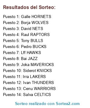 Lista de participantes: Salva CELTICS, Pedro BUCKS, Borja WOLVES, Raul RAPTORS, Ivan THUNDERS, Tony BULLS, Irra LAKERS, Siderot KNICKS, Galle HORNETS, Cenu WARRIORS, Joka MAVERICKS, Lff HAWKS, David NETS, Bai JAZZ.