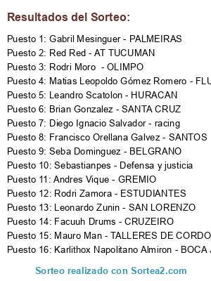 Lista de participantes: Mauro Man - TALLERES DE CORDOBA, Red Red - AT TUCUMAN, Rodri Zamora - ESTUDIANTES, Matias Leopoldo Gómez Romero - FLUMINENSE, Leonardo Zunin - SAN LORENZO, Sebastianpes - Defensa y justicia, Diego Ignacio Salvador - racing, Francisco Orellana Galvez - SANTOS, Facuuh Drums - CRUZEIRO, Karlithox Napolitano Almiron - BOCA JR, Seba Dominguez - BELGRANO, Brian Gonzalez - SANTA CRUZ, Andres Vique - GREMIO, Gabril Mesinguer - PALMEIRAS, Rodri Moro - OLIMPO, Leandro Scatolon - HURACAN.